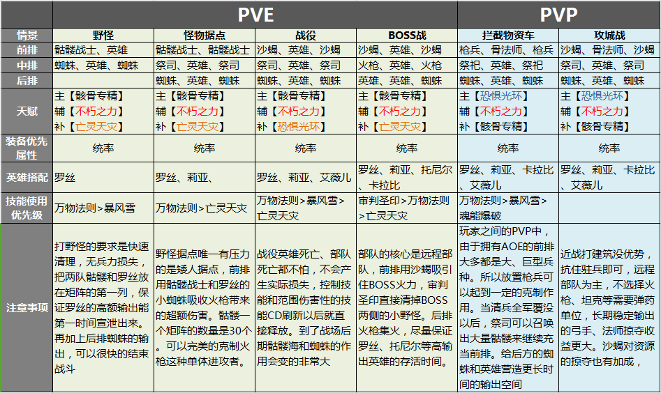 在PVE中,碰到前排带有AOE技能的小野怪,就把第一矩阵的骷髅兵更换成沙蝎。骷髅兵的特点是占用矩阵的空间小,数量多。可以用于克制单体进攻者,也可以让火枪这种高输出溢出大量伤害