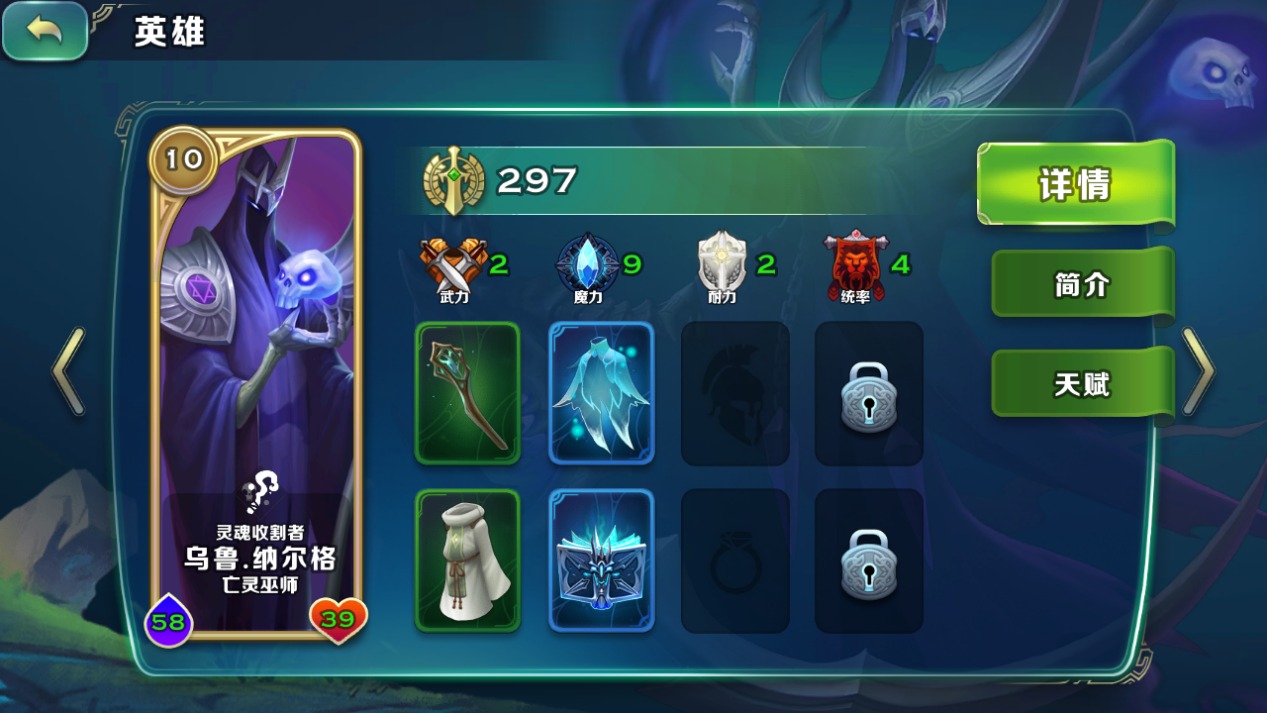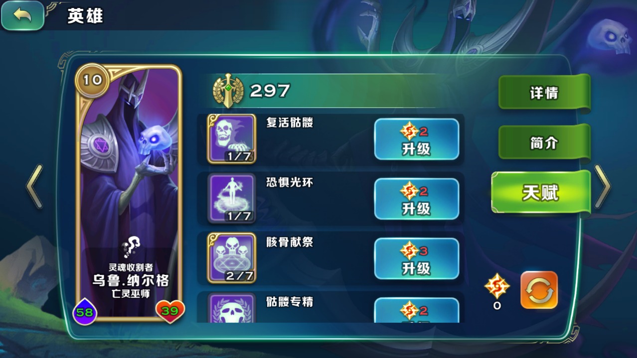 天赋选择:大家在游戏画面中的左侧可以看到一个蓝色小三角,点进后选择英雄乌鲁纳尔格。其中详情和天赋分别对应的是装备和技能,玩家在每一次的升级都会获得天赋点数,我们可以投资在不同技能上。随着技能等级的提高,所需的天赋点也会增加。以下就针对两种主要类型的玩家来作技能说明: