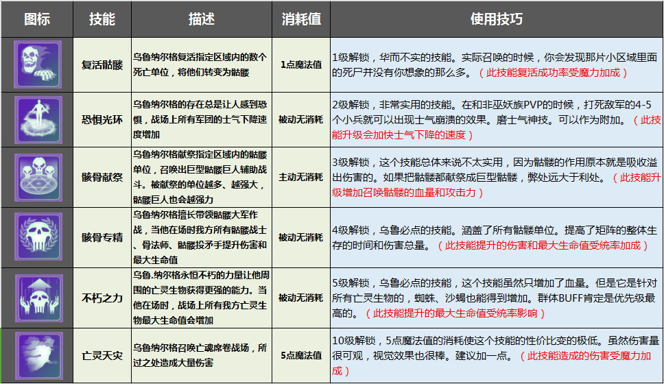 兵种、英雄搭配:乌鲁纳尔格可谓是炮灰的鼻祖,生来就是为了炮灰而存在的。复活骷髅、骸骨献祭、骸骨专精。这些技能都是为了巫妖族的炮灰-小骷髅而准备的。