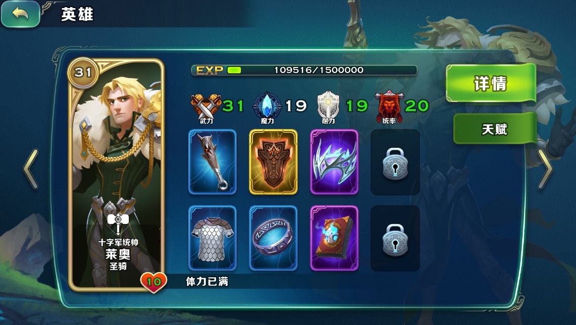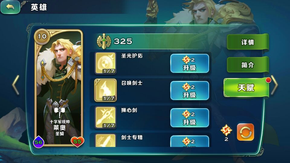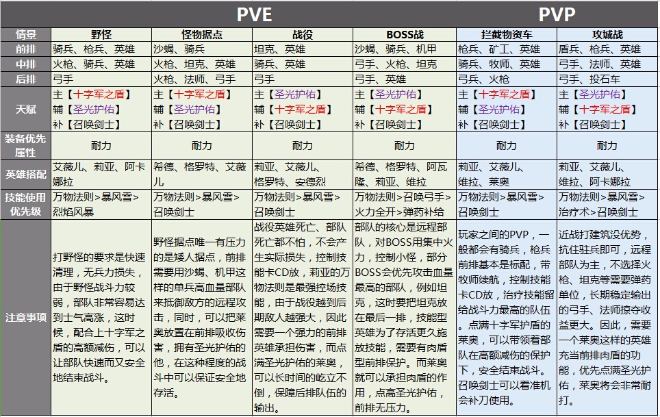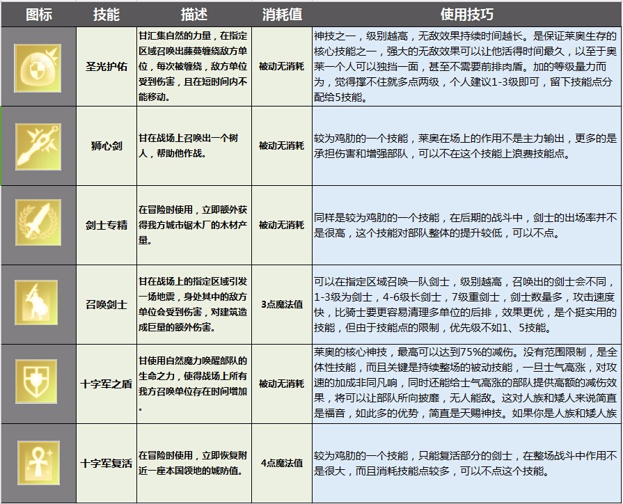 对于这样的玩家,培养莱奥是个很不错的选择,优先点满召唤剑士技能,适当点圣光庇佑和剑士专精技能,十字军之盾技能的高额减伤,可以让你的部队在士气高涨后如同起飞一般,停都停不下来。(召唤剑士:十字军之盾:圣光庇佑=5:3:2)