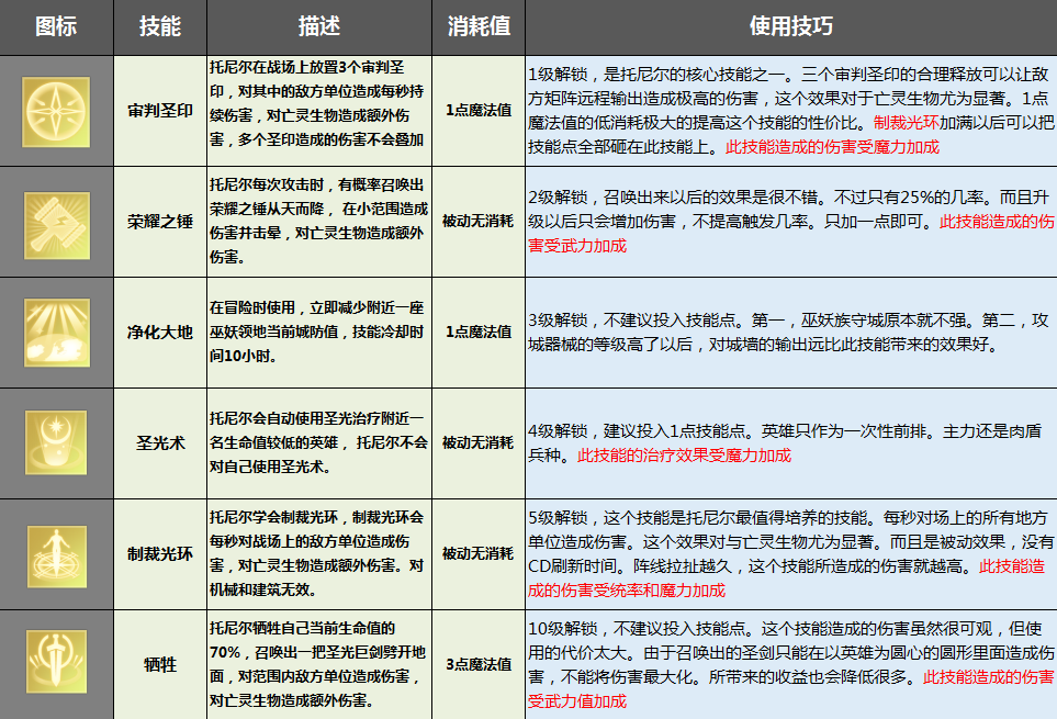 兵种、英雄搭配:从技能中我们不难看出托尼尔光环技能的强大之处。在和巫妖族对抗的时候,制裁光环这个技能可以让巫妖族的骷髅海战术瞬间失去作用。在对抗人海战术的时候,效果也是非常不错的哦。