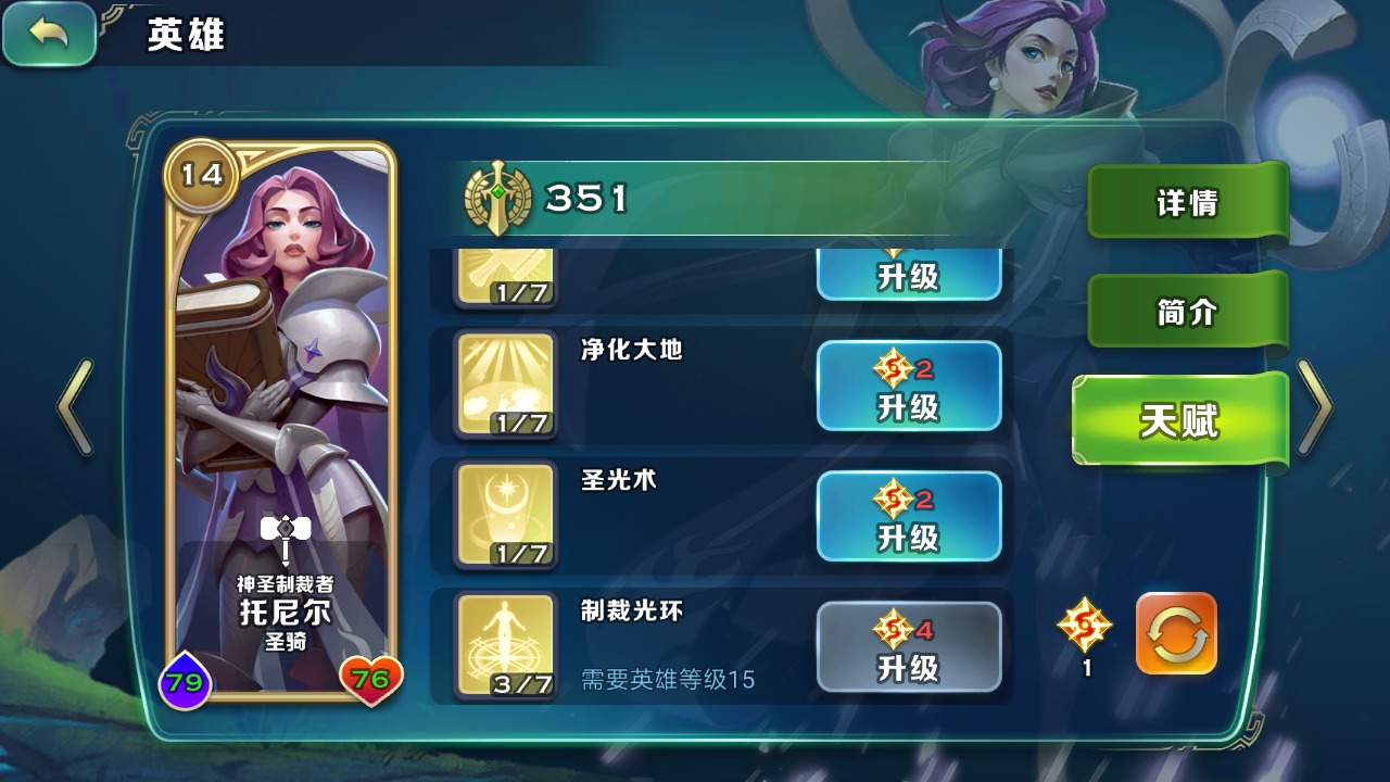 天赋选择:大家在游戏画面中的左侧可以看到一个蓝色小三角,点进后选择英雄托尼尔。其中详情和天赋分别对应的是装备和技能,玩家在每一次的升级都会获得天赋点数,我们可以投资在不同技能上。随着技能等级的提高,所需的天赋点也会增加。以下就针对两种主要类型的玩家来作技能说明: