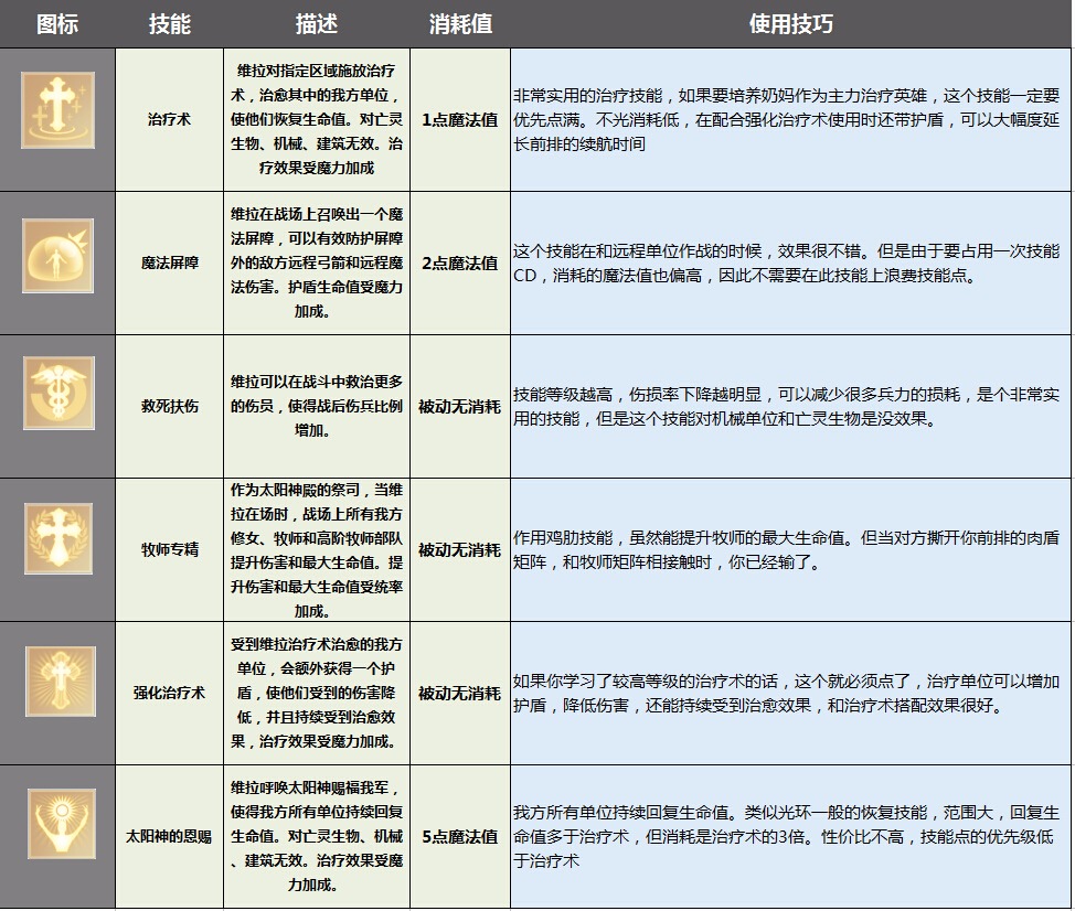 兵种、英雄搭配:维拉是个非常好用的治疗型英雄,可是由于身板很脆,需要把她放在队伍的后方,由前排的肉盾保护她。维拉更适合攻城战了,因为攻城战是个长时间的消耗战,在这里,维拉的续航作用就非常明显了。一个超大范围的光环性治疗技能太阳神的恩赐,可以轻松保障友军的生存。