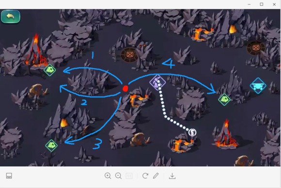 也就是如图中的1、2、3、4这四条线路。换位思考,如果是你,你一定会选择最近的帐篷,也就是图中左上角这个帐篷。而战胜方携带晶石比较大,一定也是希望找最近的帐篷进行恢复。那么,按照这个思路,大家都在大佬身边等战斗结束,但是战斗结束之后胜方可以点小火箭加速赶路,还有5秒不会被点,那么在红点位置蹲守大佬的话,很容易就被大佬跑掉。所以,我会选择在左上角帐篷边上,守株待兔。